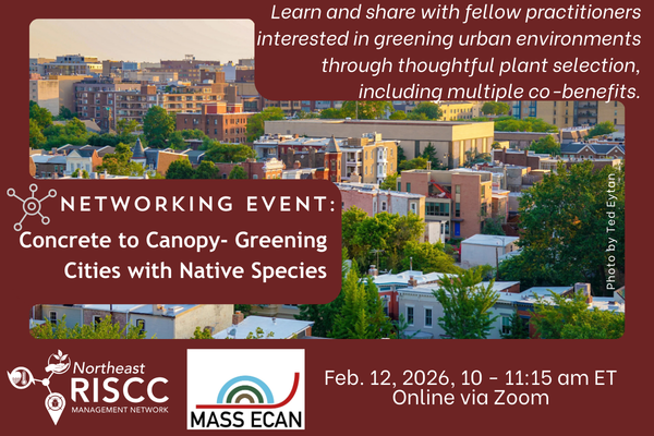 On February 12, 2026, practitioners interested in greening urban environments through thoughtful plant selection and regenerative land care discussed potential ecological, public health and safety, aesthetic, and climate adaptation co-benefits of greening in urban environments and shared resources for a systems-based approach to achieve them, given a changing climate. This event was co-hosted by Mass ECAN (Ecosystems Climate Adaptation Network) and the Northeast Regional Invasive Species and Climate Change Management Network (NE RISCC).