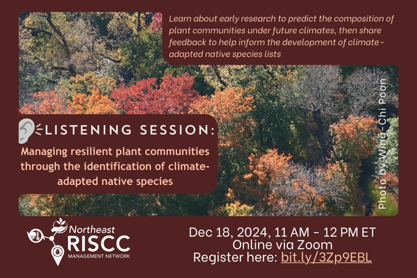 The spatial distribution of species is expected to shift under climate change as species struggle to adapt to rapidly changing conditions. Plant species are particularly at risk because they disperse slowly across the landscape. On December 18, 2024 researchers from the University of Massachusetts Amherst introduced new modeling methodologies to predict the composition of plant communities under future climates while account for the abundance of invasive species. Following this brief presentation, participants shared their perspectives on the project, how they foresee using the results, and how they thought the project could be improved in a facilitated discussion. This feedback will be integrated into the ongoing production of lists of climate-adapted native species to inform conservation management.