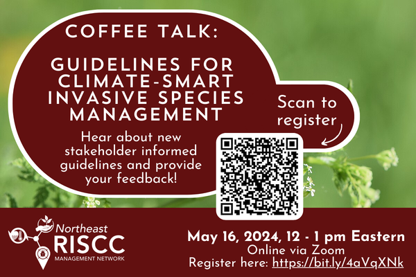 On May 16, 2024 Dr. Eva Colberg (Cornell University & New York Invasive Species Research Institute) presented the newly published "Guidelines for Climate-Smart Invasive Species Management". These guidelines were created based on feedback from the NE RISCC, a series of research interviews, and a workshop at the NY Invasive Species Expo. The presentation was followed by a discussion about what climate-smart invasive management actions participants are already doing, what they are interested in implementing, and areas for future research and support.